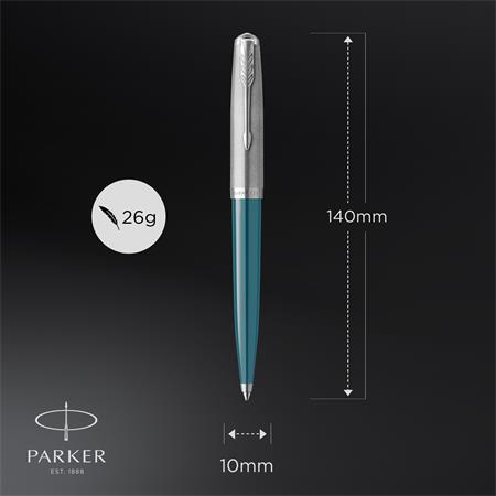 Golyóstoll, 0,7 mm rotációs, ezüst színű klip, türkiz tolltest, PARKER "Royal 51 Core", fekete